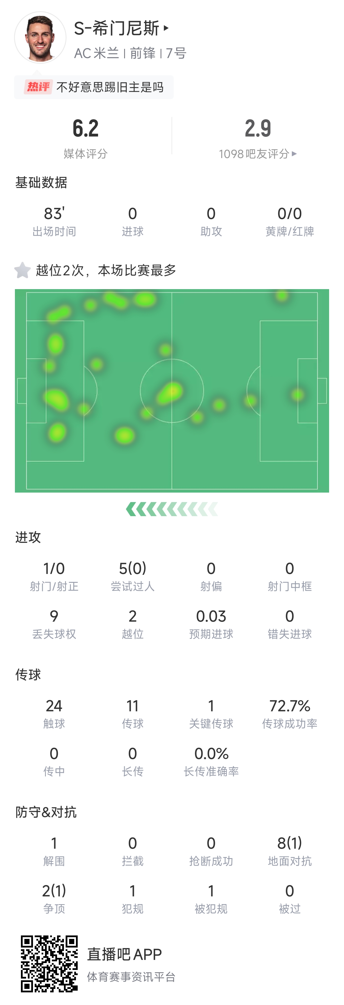 本场对阵旧主,希门尼斯出战83分钟仅有1脚射门,没有射正。他5次过人0成功,8次对抗1成功,还有2次越位。在24次触球的数据中,希门尼斯9次丢球权,11次传球72%成功率,包含一次关键传球。