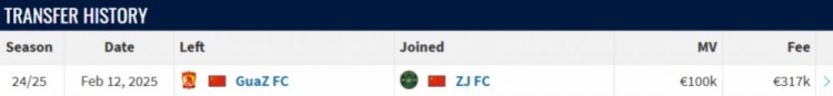 德转显示原广州队门将霍深坪加盟浙江队,转会费31.7万欧